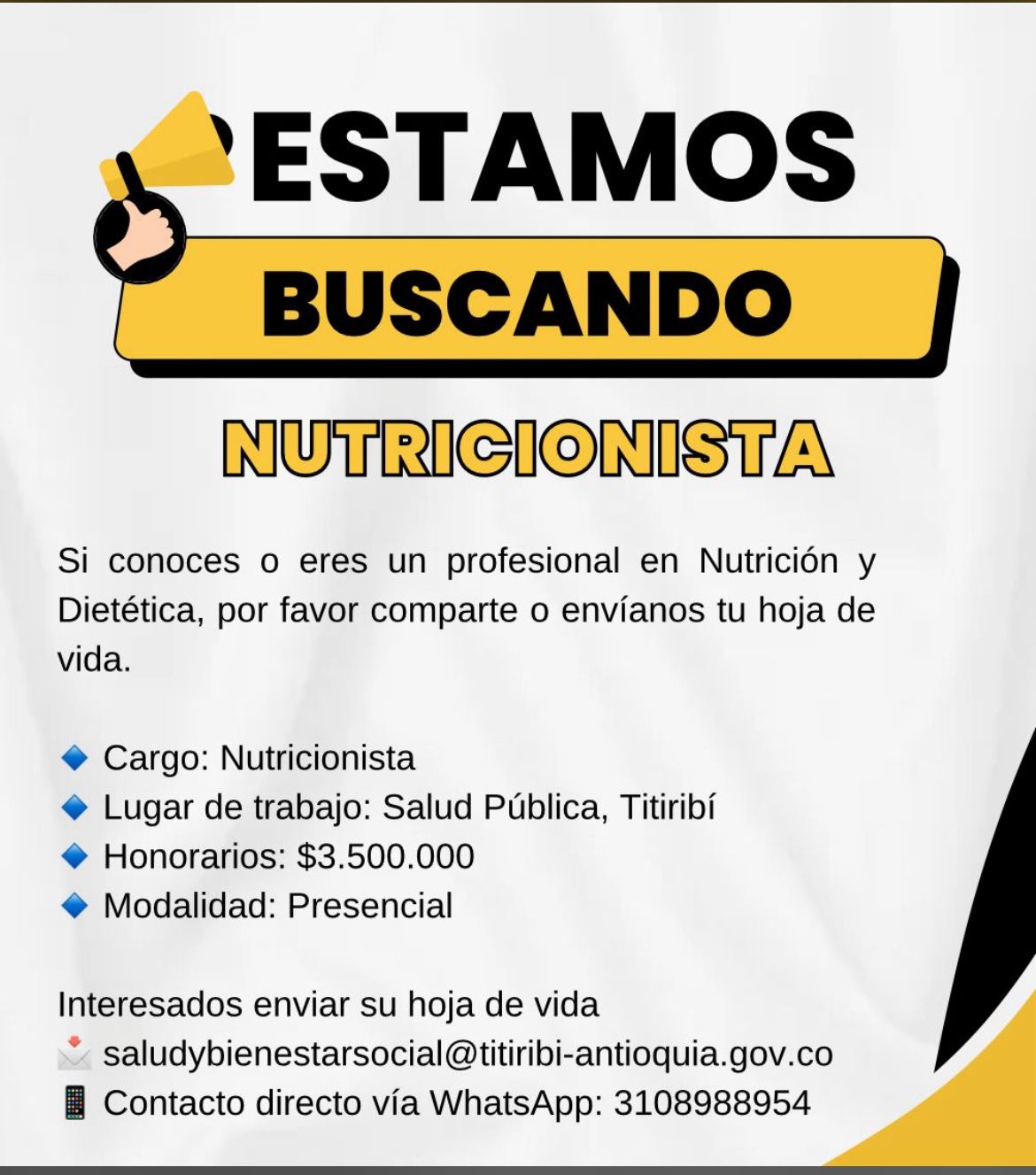 En el municipio de Titiribí, ubicado en el suroeste antioqueño, se abre una puerta laboral con un profundo sentido social: se busca profesional en Nutrición y Dietética para sumarse al equipo de salud pública del municipio, con un enfoque directo y presencial en territorio.