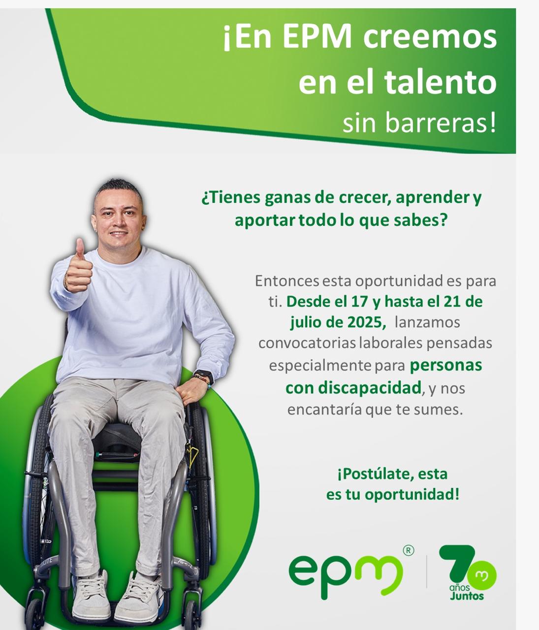 Cuéntales que del 17 al 21 de julio de 2025 abrimos convocatorias laborales para personas con discapacidad. Tenemos vacantes para técnicos, tecnólogos y profesionales que ya cuenten con su título. No necesitan experiencia previa. La postulación se hace solo a través de nuestro Portal de Empleo .