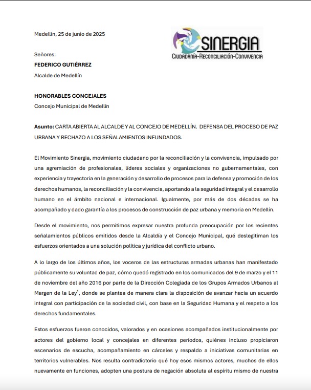 El Movimiento Sinergia, una organización ciudadana con amplia trayectoria en la promoción de los derechos humanos y la construcción de paz en Medellín, publicó este lunes una carta abierta dirigida al alcalde Federico Gutiérrez y al Concejo Municipal, expresando su preocupación frente a recientes declaraciones oficiales que, según ellos, deslegitiman el actual proceso de paz urbana que se adelanta en la ciudad.