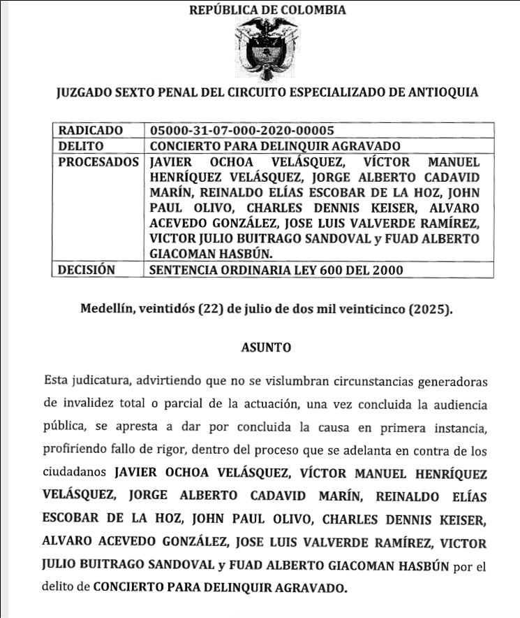En un fallo sin precedentes, el Juzgado Sexto Penal del Circuito Especializado de Antioquia condenó a siete exdirectivos de la multinacional Chiquita Brands por el delito de concierto para delinquir agravado, al confirmarse que la compañía financió a las Autodefensas Unidas de Colombia (AUC) entre 1997 y 2004.