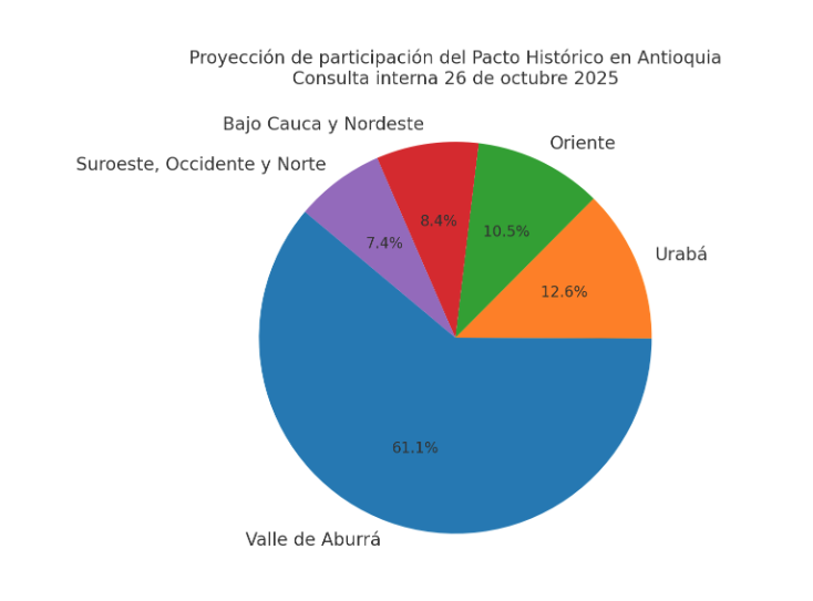 El Valle de Aburrá, con Medellín como núcleo central, es la joya de la corona para el Pacto. Se proyecta que allí se concentren cerca del 60 % de los votos internos. Sectores estudiantiles, sindicales, colectivos de mujeres y comunidades barriales representan el principal motor de movilización. La apuesta estará en superar el umbral de 150.000 votos en este territorio si la participación global alcanza los 300.000.
